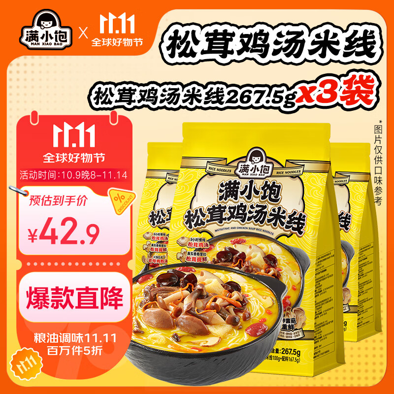 满小饱松茸鸡汤米线267.5g*3袋浓郁鲜香添加菌菇 速煮细米线方便速食