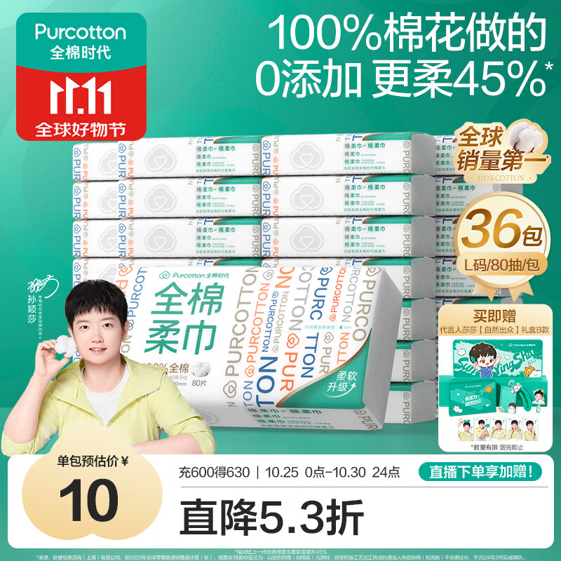 全棉时代【孙颖莎同款】洗脸巾 80抽*36包100%棉柔毛巾一次性整箱20*20CM