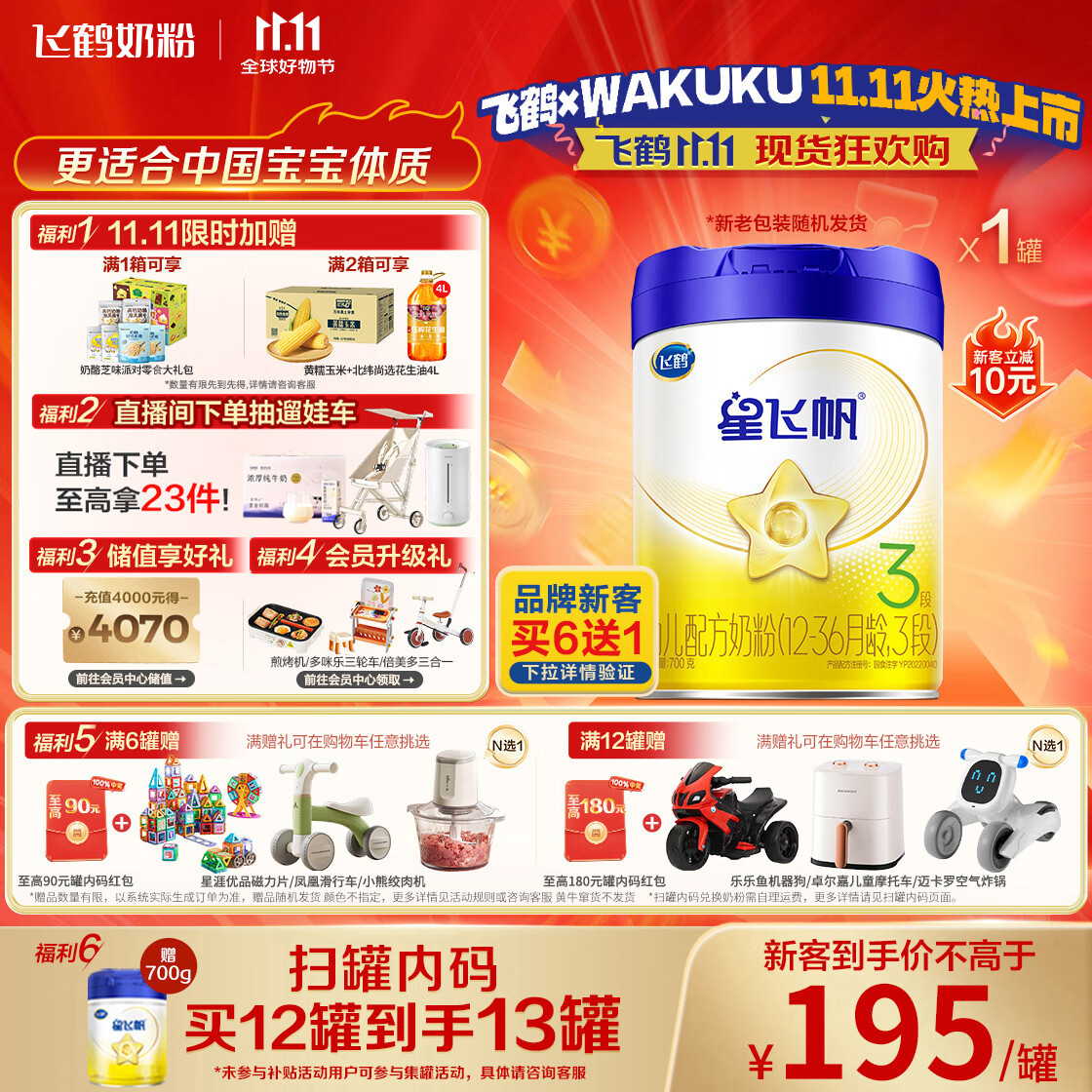 飞鹤星飞帆 婴幼儿配方奶粉3段(1-3岁) 700g 专利OPO 育儿补贴