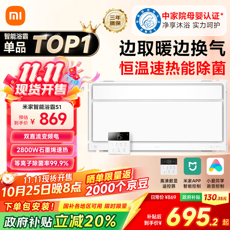 米家(MIJIA)小米智能浴霸S1【政府补贴15%】暖风照明排气一体等离子除菌速热