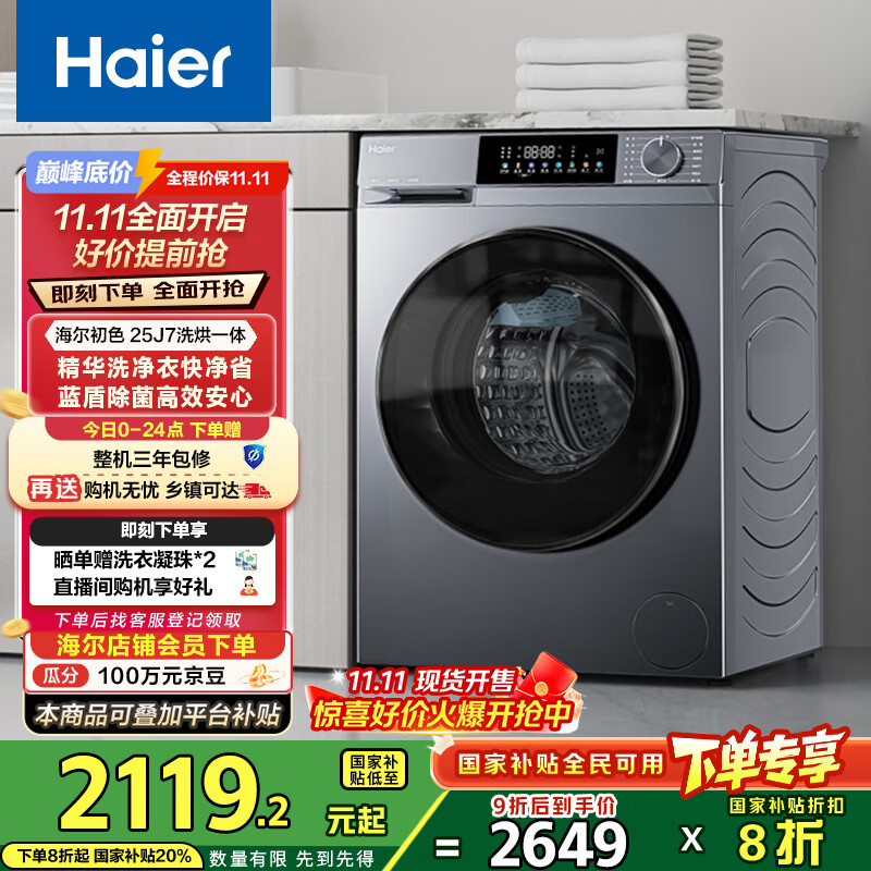 海尔(Haier)滚筒洗衣机全自动 超薄洗烘一体带烘干 家用家电国家补贴10公斤一级能效以旧换新 京东自营HE25J7