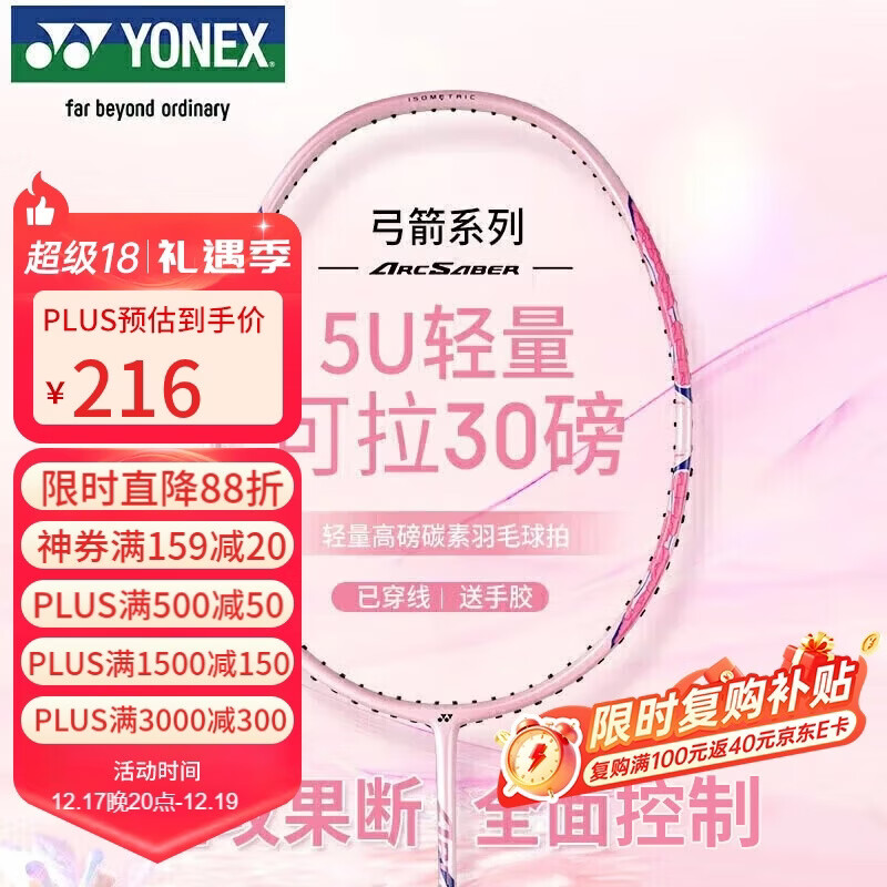 尤尼克斯(YONEX)羽毛球拍全碳素精准控球高磅弓箭比赛ARC8樱花粉已穿24磅附手胶
