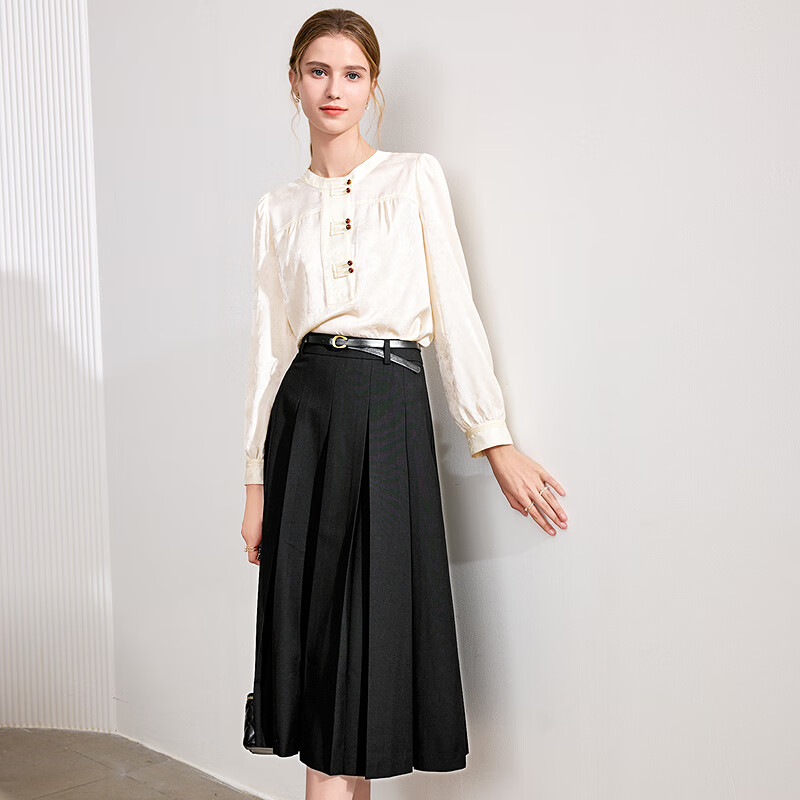 百图betu女装秋季新款衬衫新中式领衬衣暗纹提花衬衫女2408T44 浅杏色 L