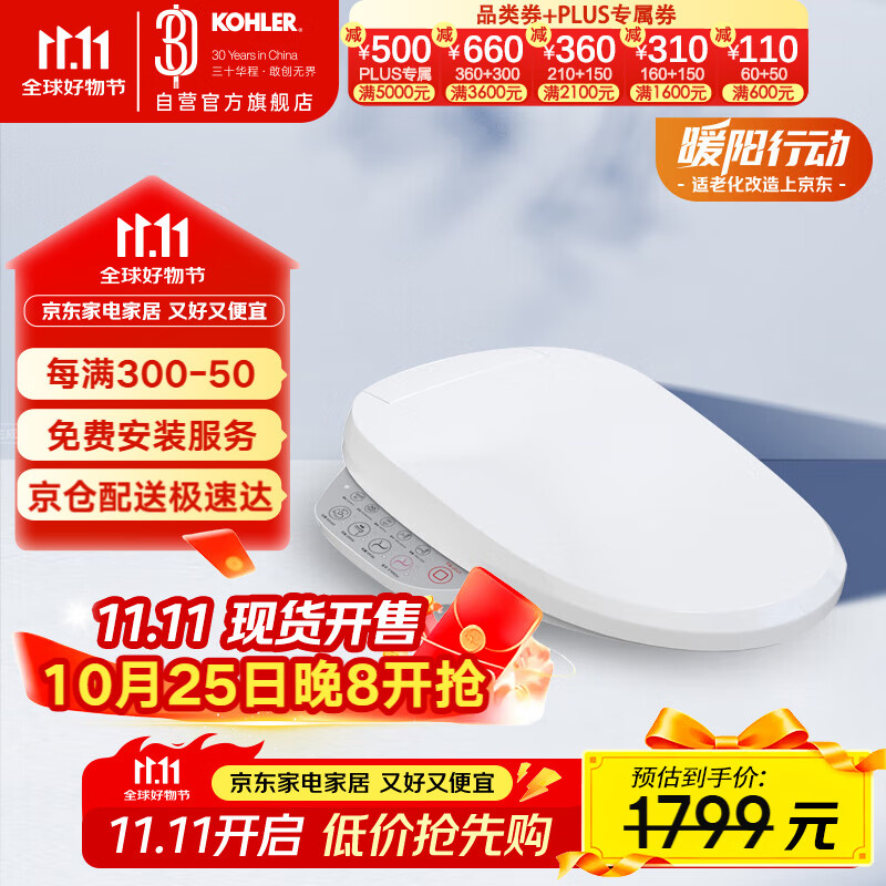 科勒(KOHLER)智能马桶盖智能坐便盖清舒宝C3-149恒动速热式全功能K-18649T-0
