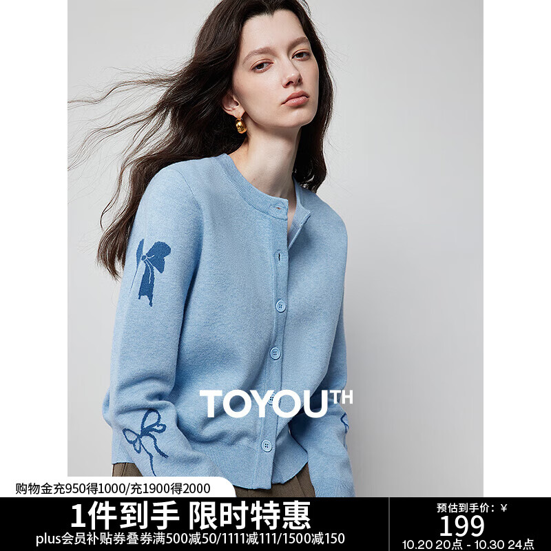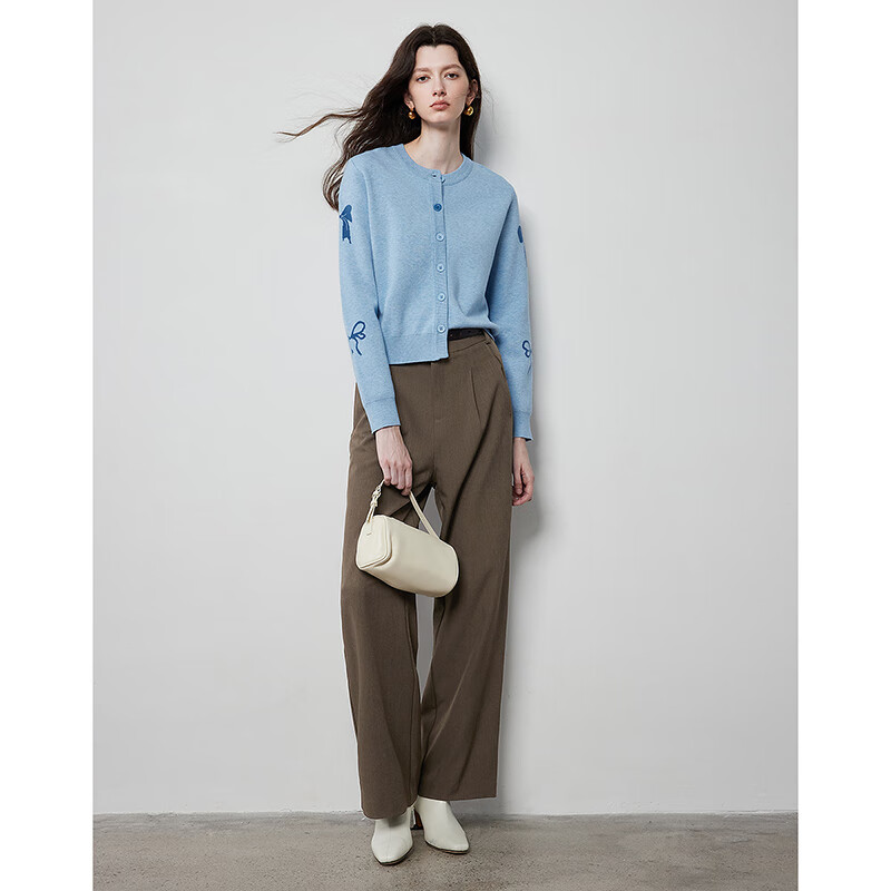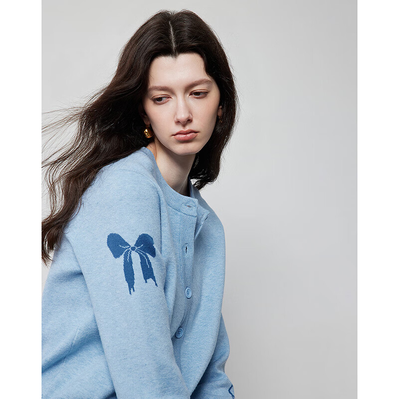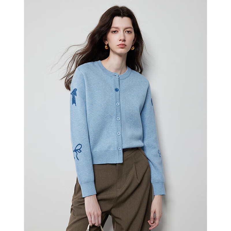初语蝴蝶结提花针织衫女25秋季新款圆领气质上衣开衫 浅蓝色 M