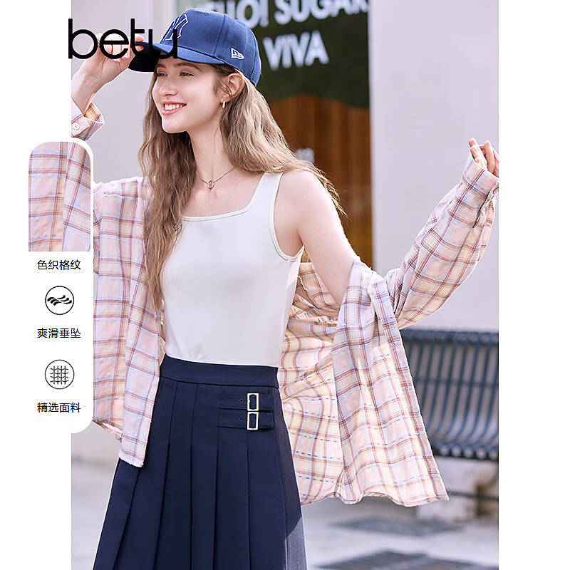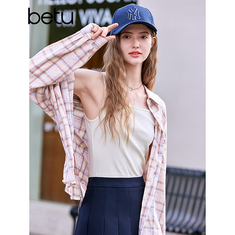 百图betu女装2025春季新款衬衫美式复古宽松格子开衫外套女2502T33 粉红 M