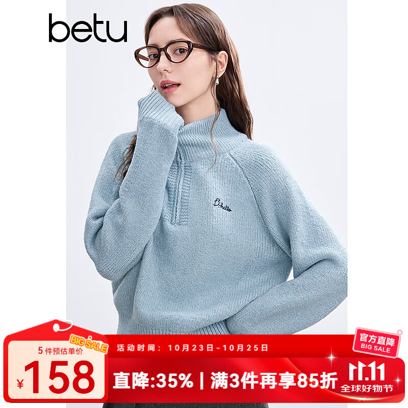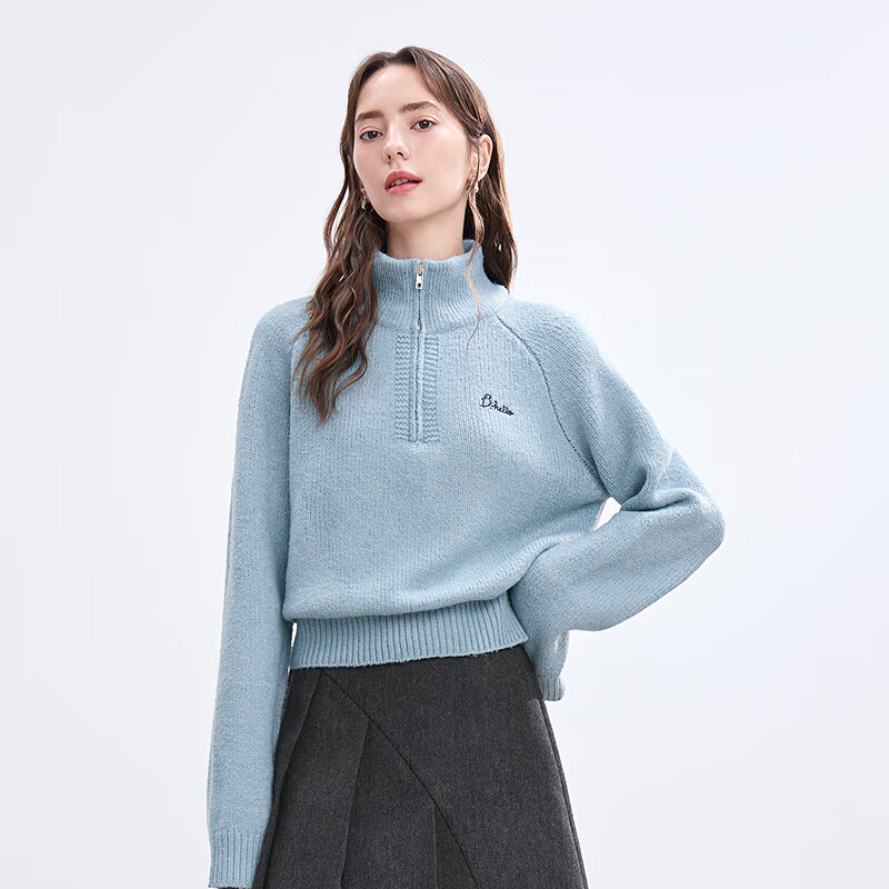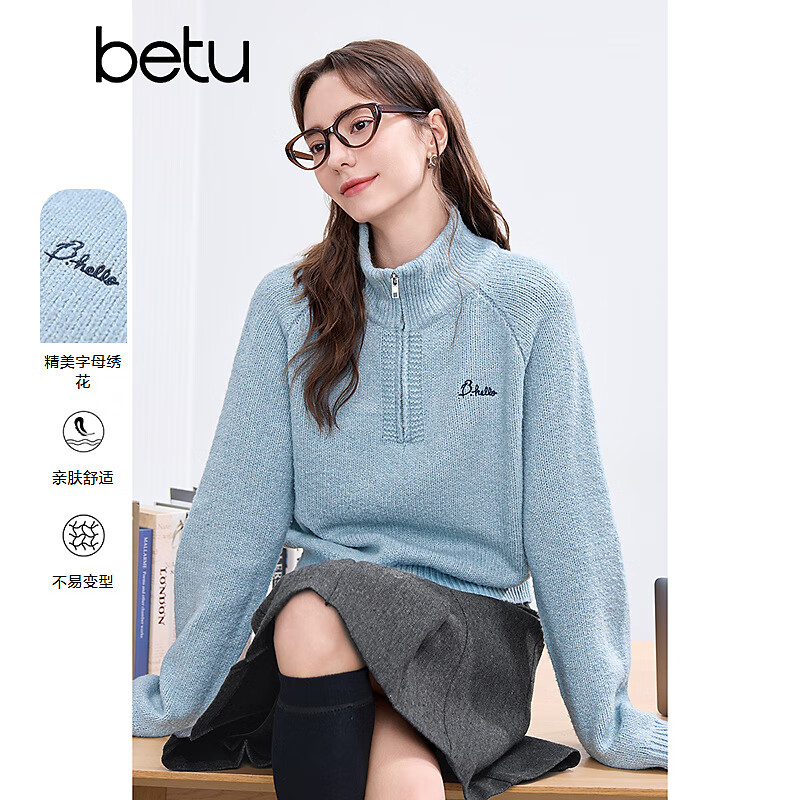 百图betu女装冬季新款毛衣高领宽松字母刺绣插肩袖毛衣女2411T39 湖兰色 XS