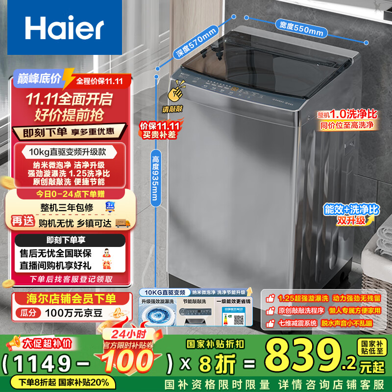 海尔(Haier)波轮洗衣机全自动家用10公斤大容量XQB100-BZ20D0直驱变频京东自营家电国家补贴一级能效节能超薄