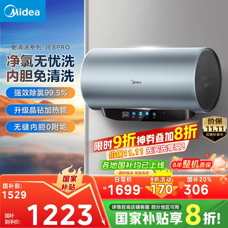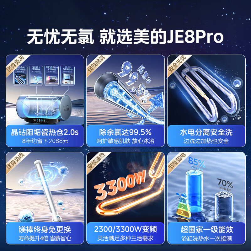 美的(Midea)免清洗电热水器60升家用3300W变频储水式水电分离除氯养肤洗以旧换新国家补贴20%F6033-JE8Pro(HE)