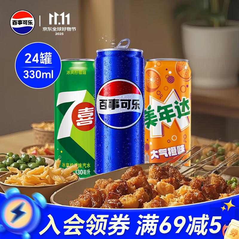百事可乐Pepsi 可乐*8+7喜*8+美年达*8 碳酸饮料汽水330ml*24 混合装