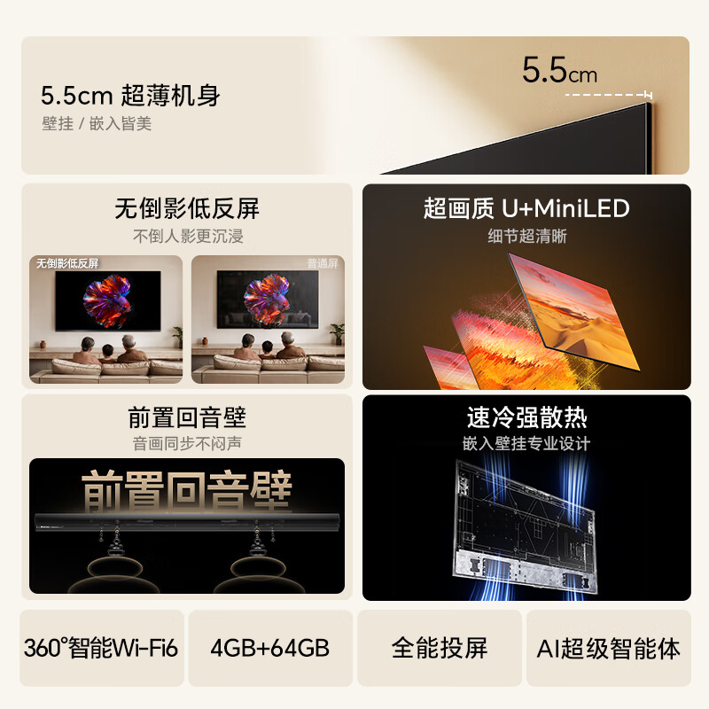海信电视大薄荷E52Q 75吋 超薄贴墙 无倒影低反屏 前置回音壁 超画质U+MiniLED国家补贴壁纸电视75E52Q