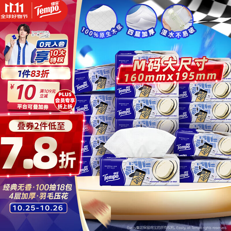 得宝(TEMPO)一博同款 抽纸 M码 无香4层100抽*18包 新旧包装混发 纸巾卫生纸