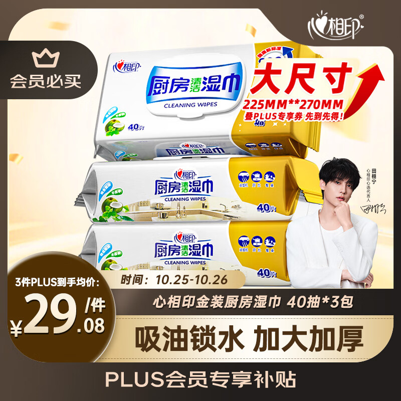 心相印厨房湿巾 40抽*3包 金装去油污厨房专用湿纸巾 新老包装随机发