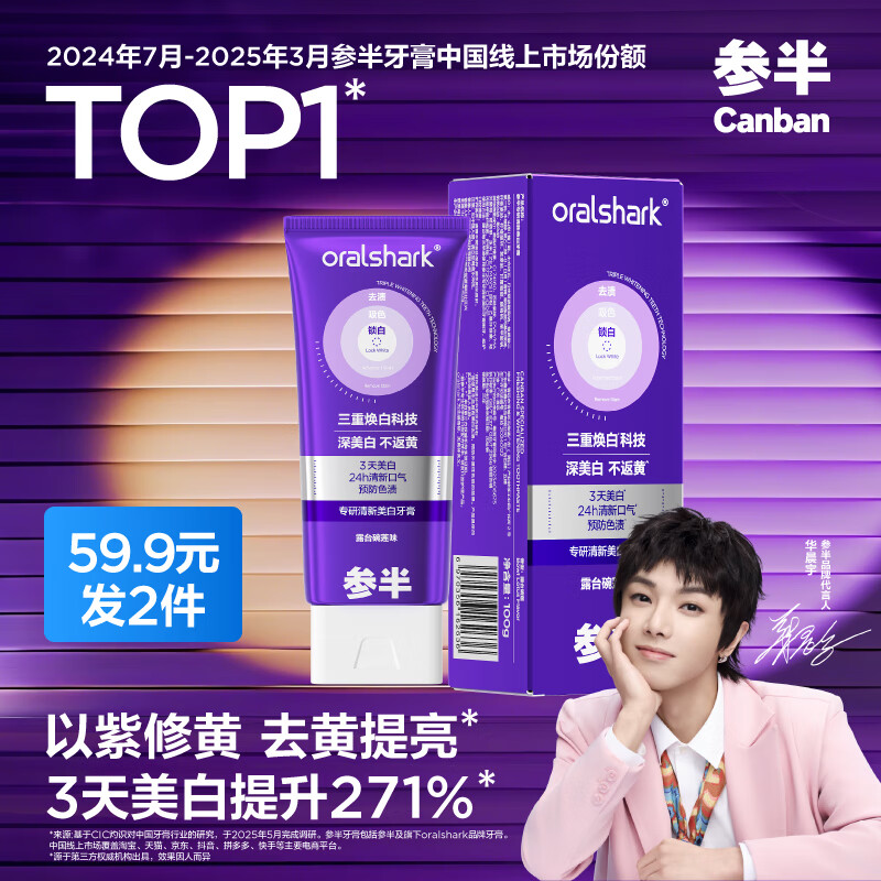 参半华晨宇同款 专研清新美白小紫管牙膏色修去渍亮白100g