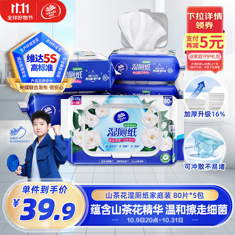 维达(Vinda)湿厕纸 家庭装80片*5包 山茶花精华 加厚洁厕湿纸巾湿纸巾可冲散