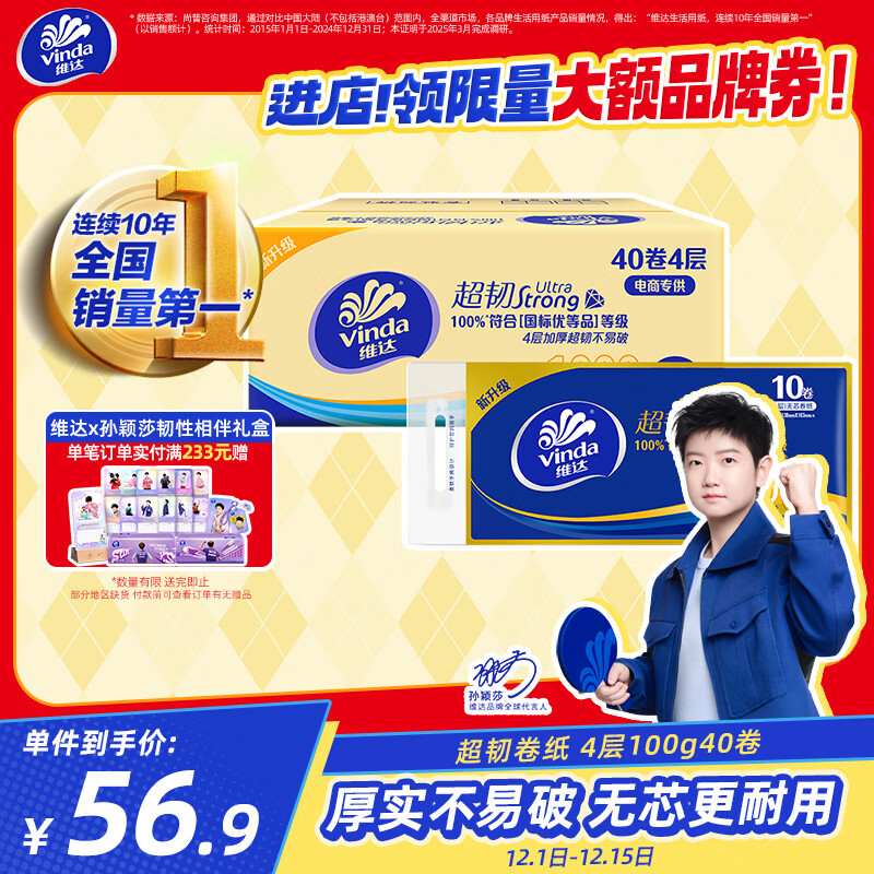维达(Vinda)无芯卷纸 超韧4层100克*40卷 加厚升级 洁厕纸整箱 新旧随机发货