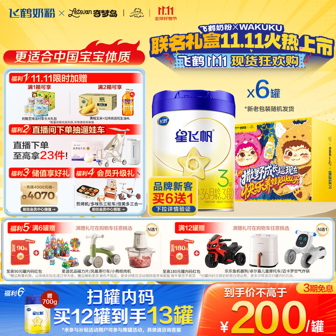 飞鹤星飞帆 婴幼儿配方奶粉3段(1-3岁) 700g*6 专利OPO 育儿补贴
