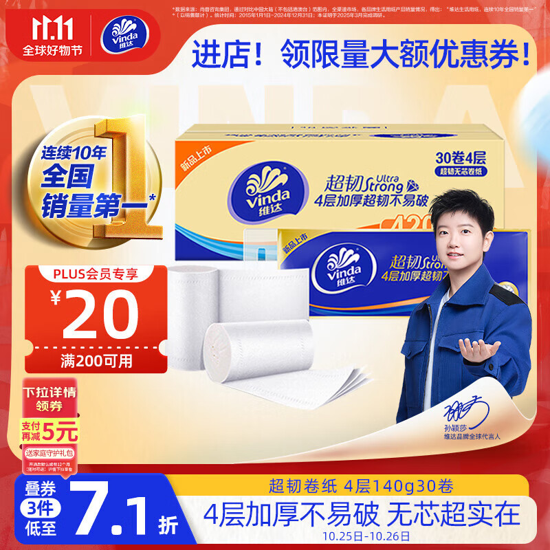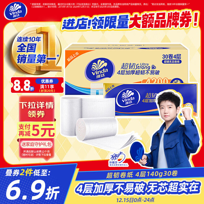 维达(Vinda)无芯卷纸 超韧4层140克*30卷 加厚升级 卫生纸厕纸 卷筒纸 整箱