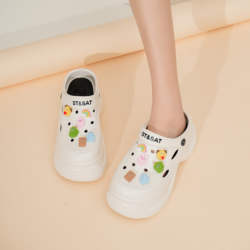星期六踩屎感软底洞洞鞋女新款2025夏季舒适百搭厚底增高透气凉鞋凉拖鞋 白色 38-39