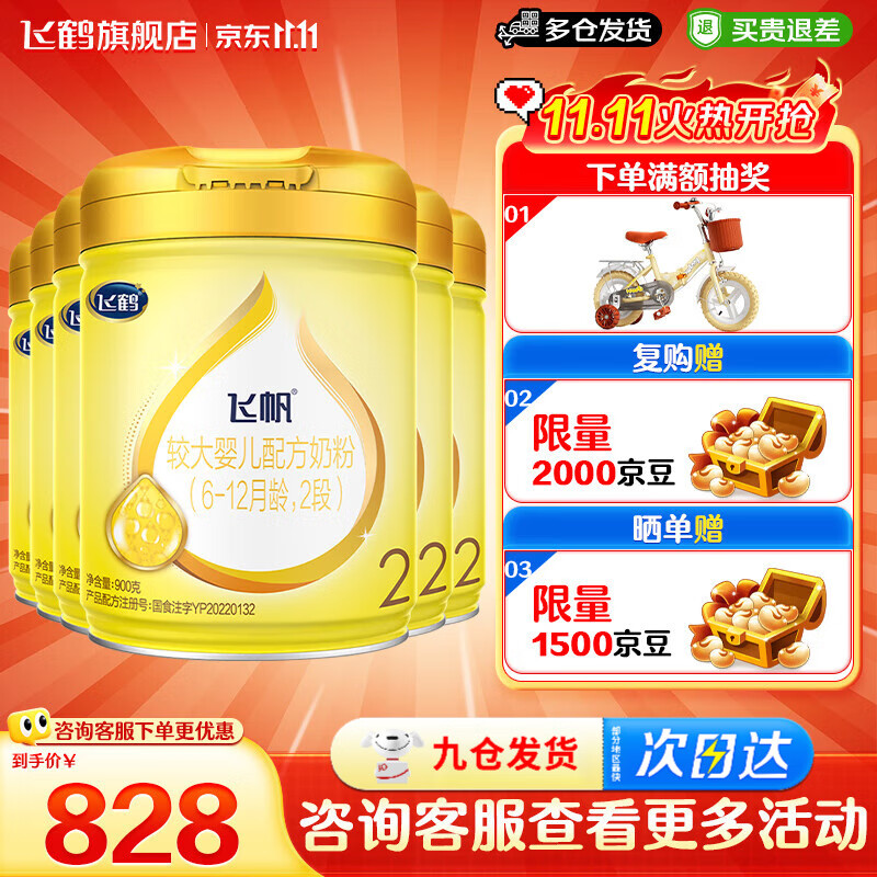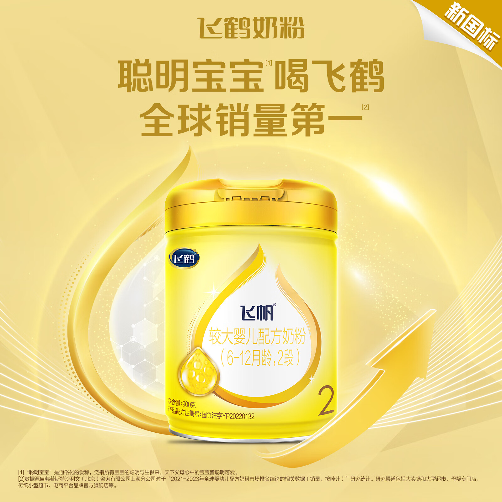 飞鹤飞帆呵护2段900克较大婴儿配方奶粉(6-12个月适用) 6罐 (入会享会员福利)