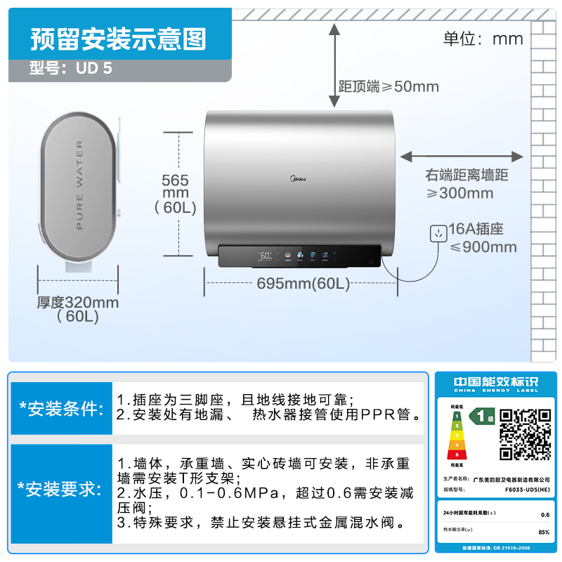 美的(Midea)60升玲珑超薄双胆扁桶电热水器3300W家用一级能效镁棒免换速热F6033-UD5(HE)以旧换新国家补贴