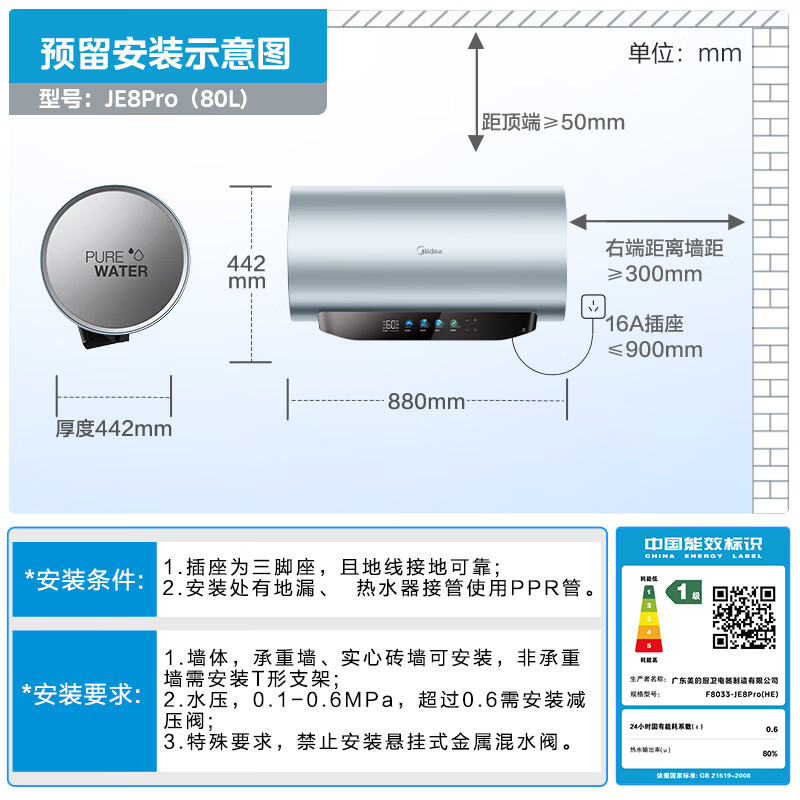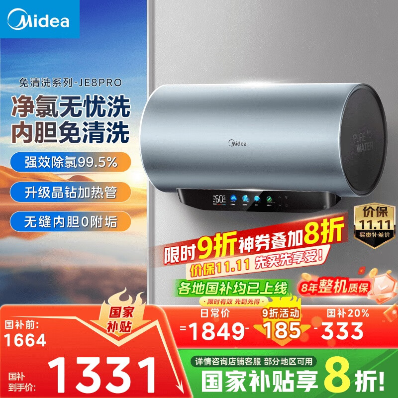 美的(Midea)免清洗电热水器80升家用 3300W变频速热水电分离除氯养肤洗以旧换新国家补贴20%F8033-JE8Pro(HE)