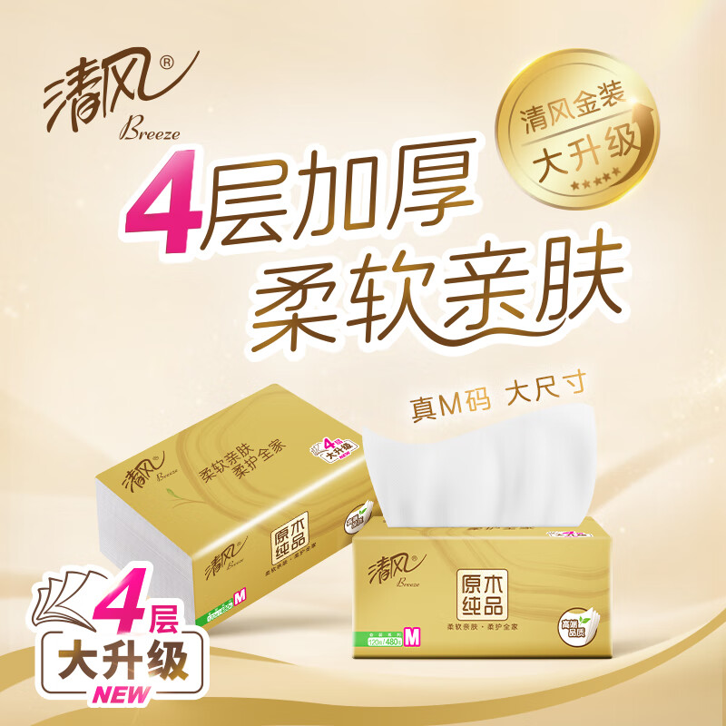 清风【李昀锐同款】抽纸 丝柔4层120抽*3包M码 卫生纸巾 新老包装交替