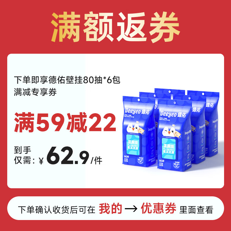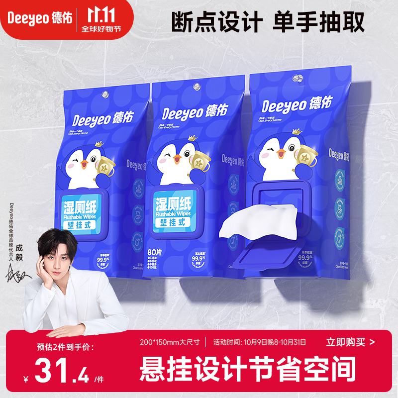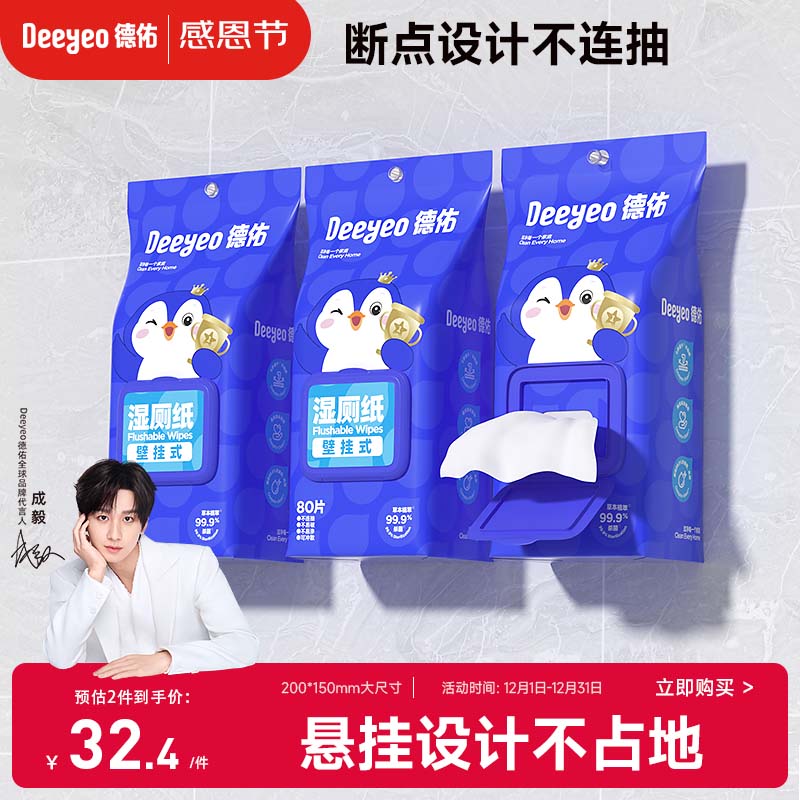 德佑悬挂湿厕纸80抽*3包 厕纸湿巾洁厕如厕湿纸巾 悬挂式单手可抽取