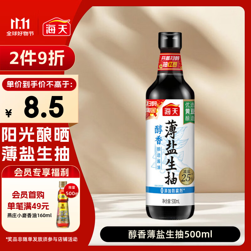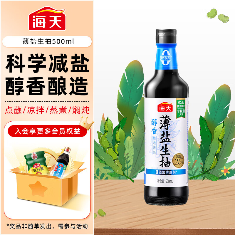 海天 醇香生抽酱油500ml【薄盐一级酱油】薄盐系列 0添加防腐剂