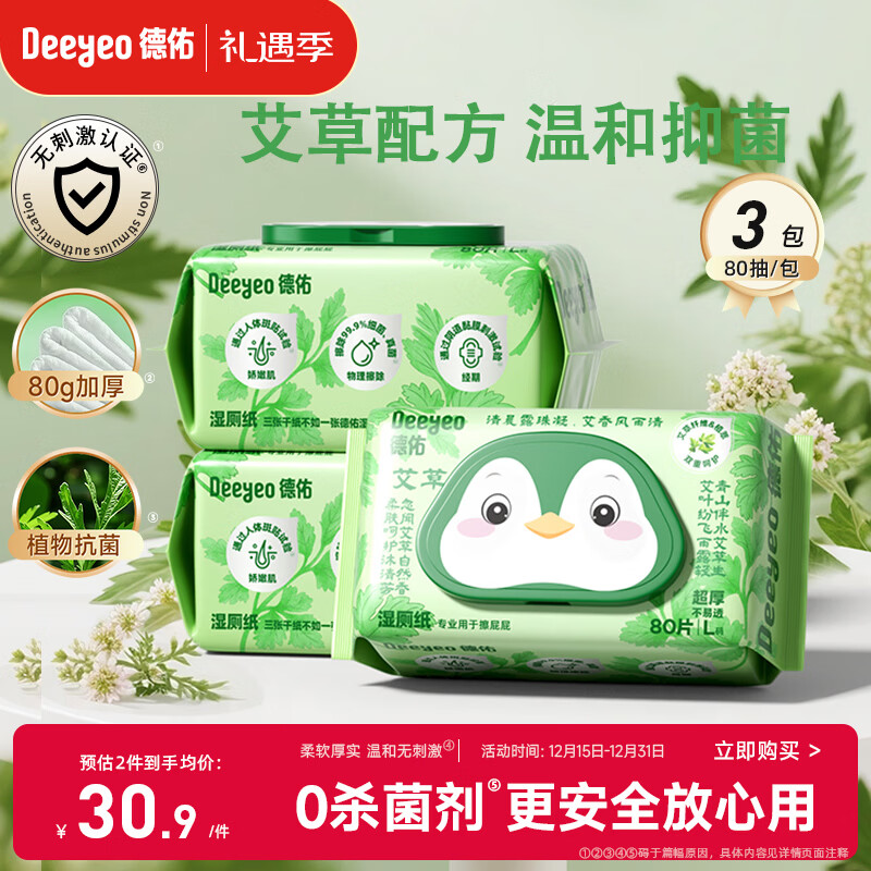 德佑艾草湿厕纸尝新装80抽*3包 厕纸湿巾洁厕如厕纸巾 湿厕纸可冲散t