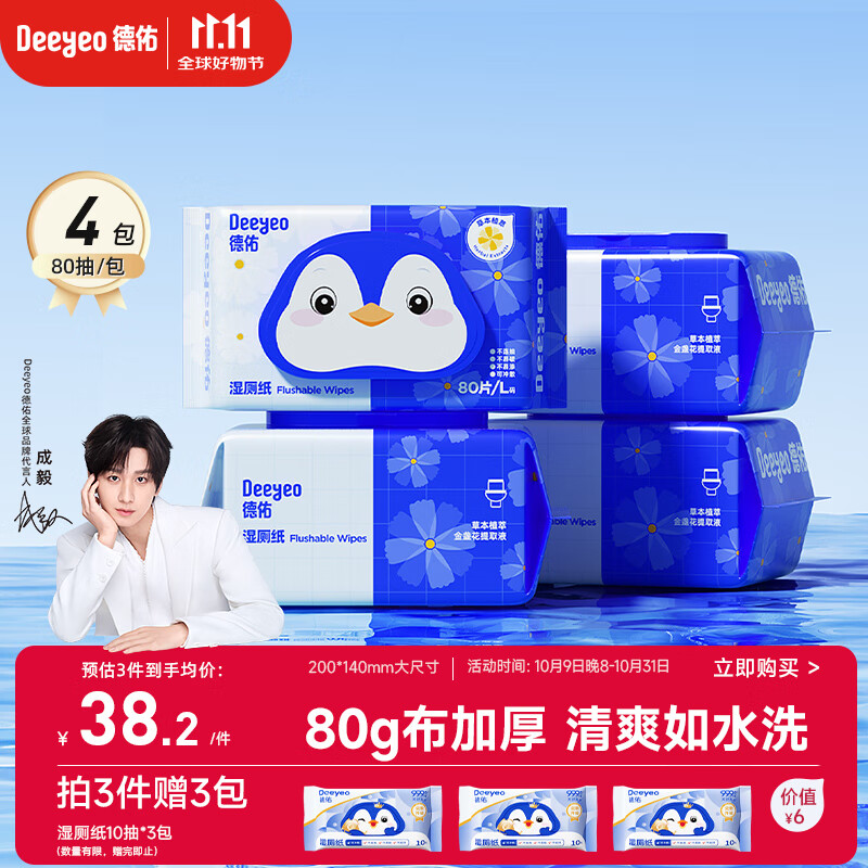 德佑湿厕纸家庭装80抽*4包 洁厕湿纸巾厕纸湿巾 经期湿纸巾 温和亲肤