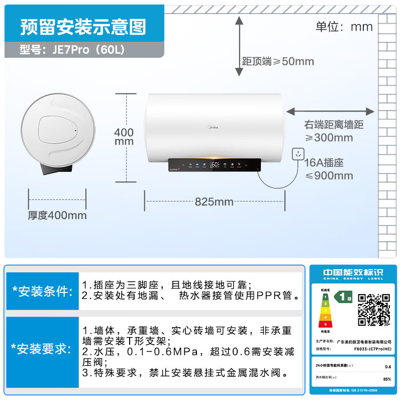 美的(Midea)阻垢免清洗电热水器60升家用3300W变频速热镁棒免更换以旧换新国家补贴20%热水器F6033-JE7Pro(HE)