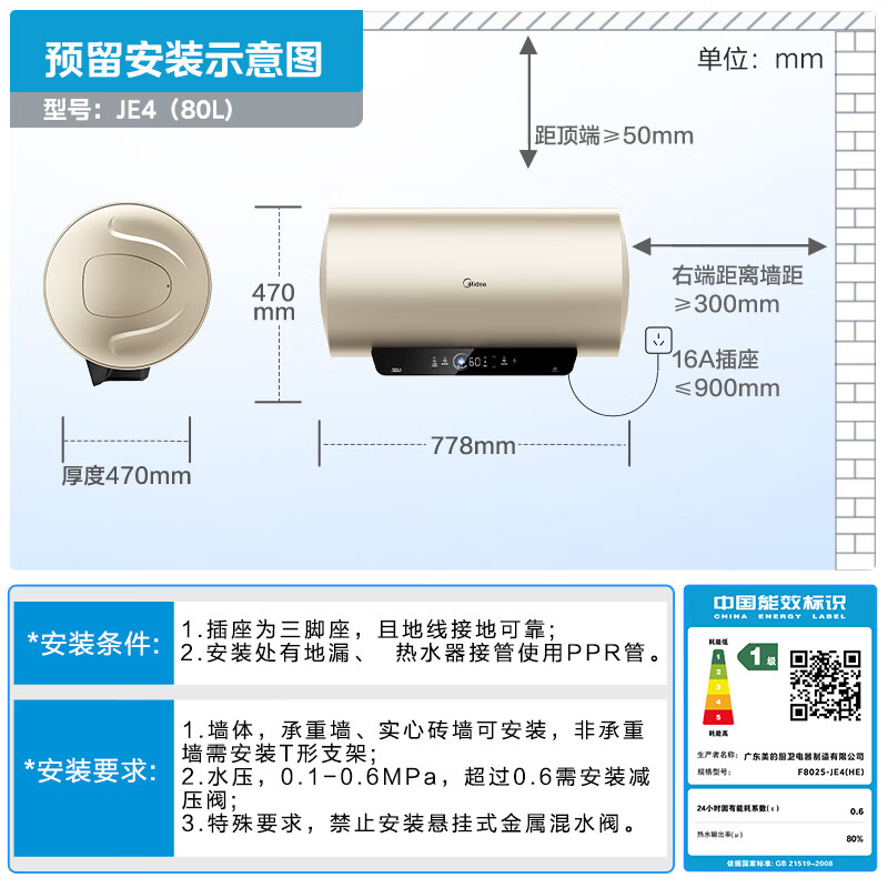 美的(Midea)国家补贴20% 终身免换镁棒80升2500W 一级能效40倍耐用加热管 电热水器 F8025-JE4(HE)