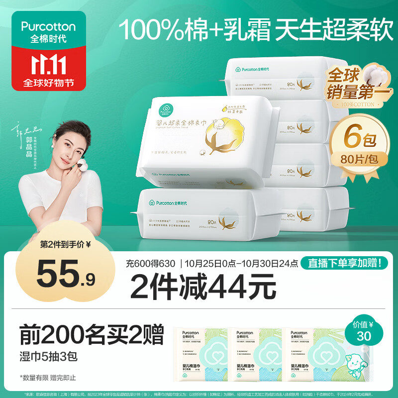 全棉时代【孙颖莎同款】婴儿纯棉棉柔巾超柔乳霜洗脸巾成人可用80抽*6包
