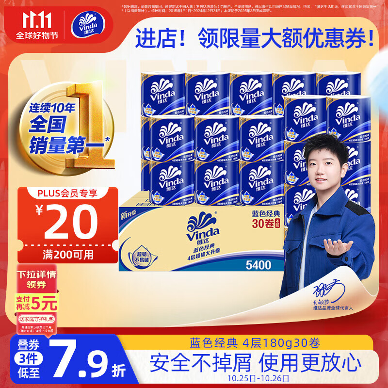 维达(Vinda)卷纸 蓝色经典有芯卷纸4层180克*30卷 加厚 纸巾 整箱