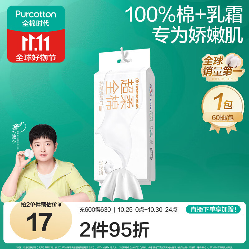 全棉时代【孙颖莎同款】乳霜洗脸巾 60抽/包*1加厚悬壁挂式100%棉柔巾毛巾