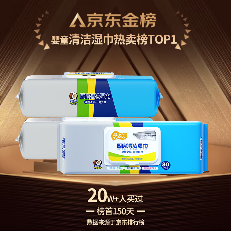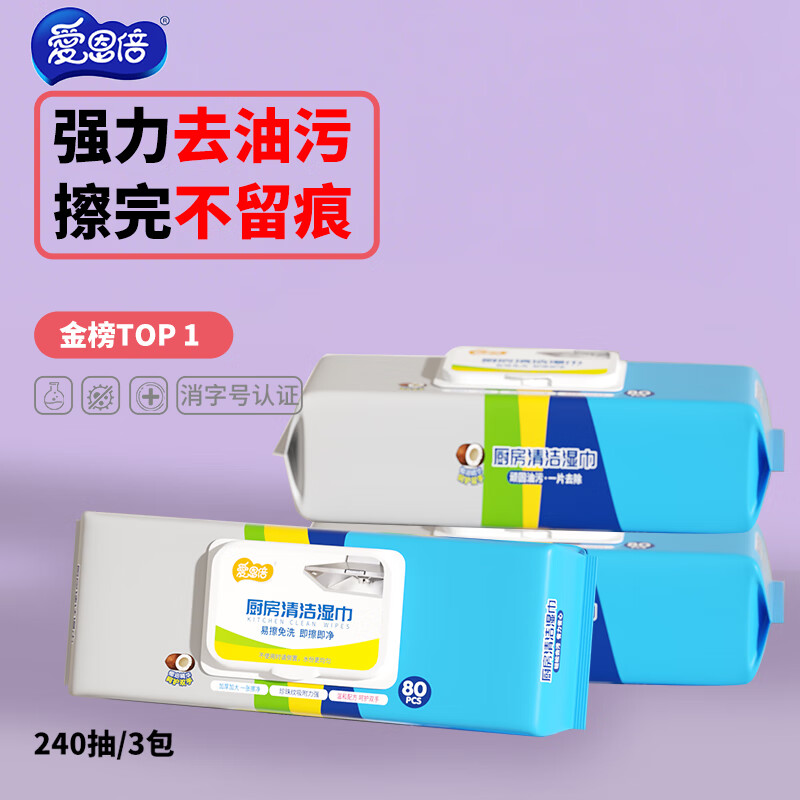 爱恩倍厨房湿巾80抽*3包去油污湿纸巾加大加厚擦油烟机清洁儿童玩具清洁