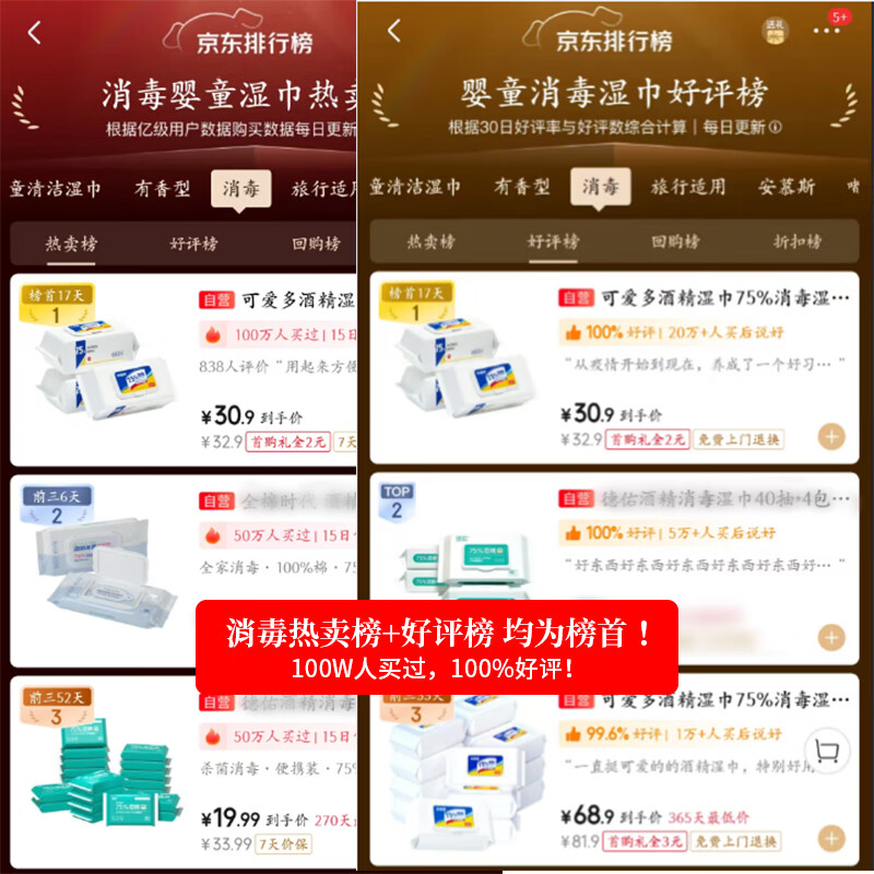 可爱多75%酒精湿巾80抽10包99.9%消毒杀菌一次性儿童卫生湿纸巾家庭装