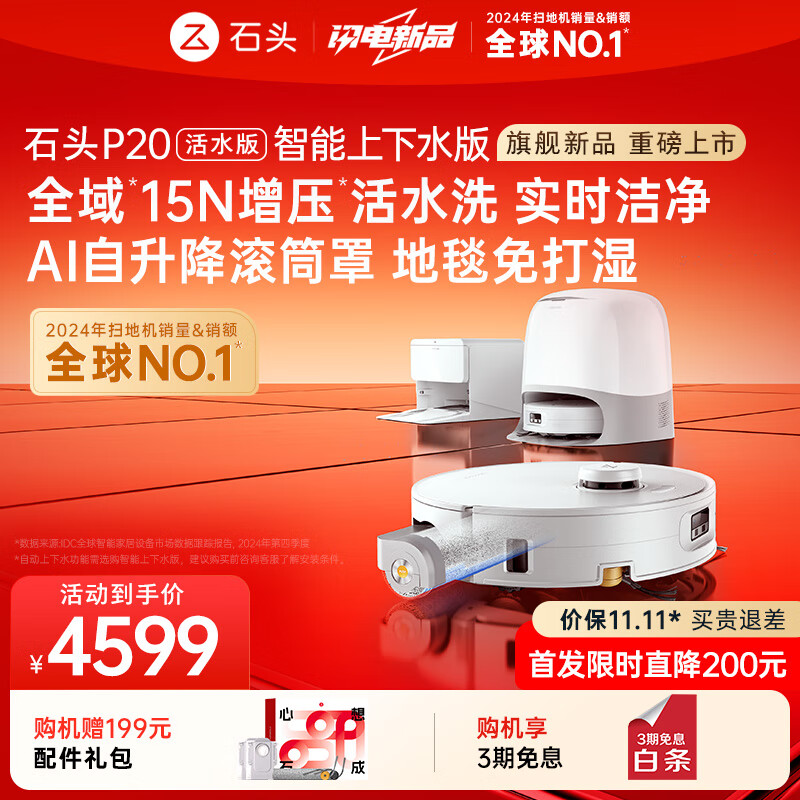石头(roborock)扫地机器人扫拖一体 P20 活水版 自动上下水版 滚筒洗地机器人 热水洗拖布擦地拖地吸尘器 A2440RR