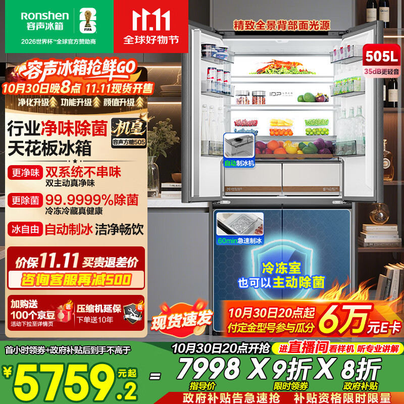 容声方糖505机皇双净双系统十字四开门超薄嵌入式电冰箱家用自动制冰一级能效BCD-505P60CZNAD国家补贴