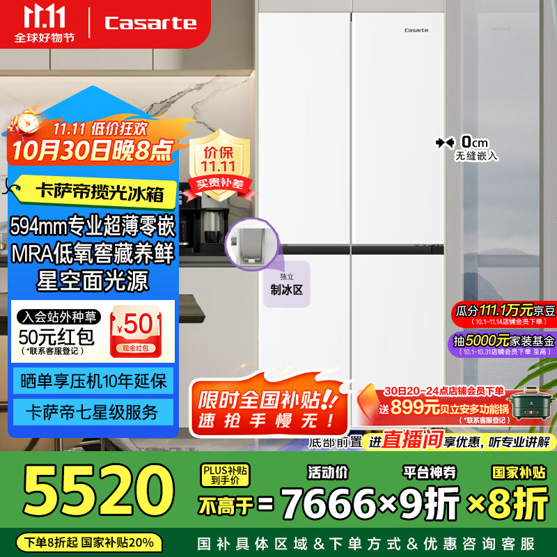卡萨帝(Casarte)揽光系列477升超薄零嵌入式手动制冰一级能效国家补贴20%BCD-477WGCTDM4WKU1T型十字门冰箱