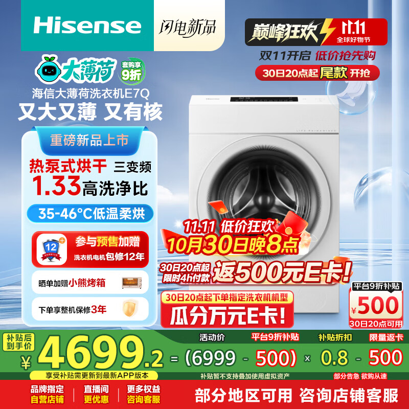 海信(Hisense)大薄荷热泵洗烘一体E7Q洗衣机棉花糖 全自动滚筒洗衣机13公斤大容量 活水洗 WH130E7Q 国家补贴