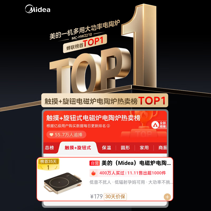 美的(Midea)电磁炉电陶炉电池炉2200W大功率猛火围炉煮茶烧水炒菜 电磁灶煮茶器双环控火不挑锅国家补贴HW2210