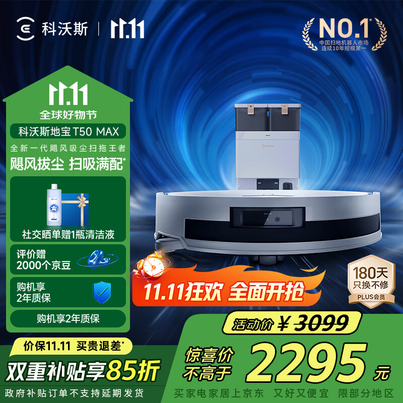 科沃斯【全程保价11.11】T50MAX扫地机器人扫拖一体自动清洗智能家用双机械臂超薄毛发0缠水箱版国家补贴