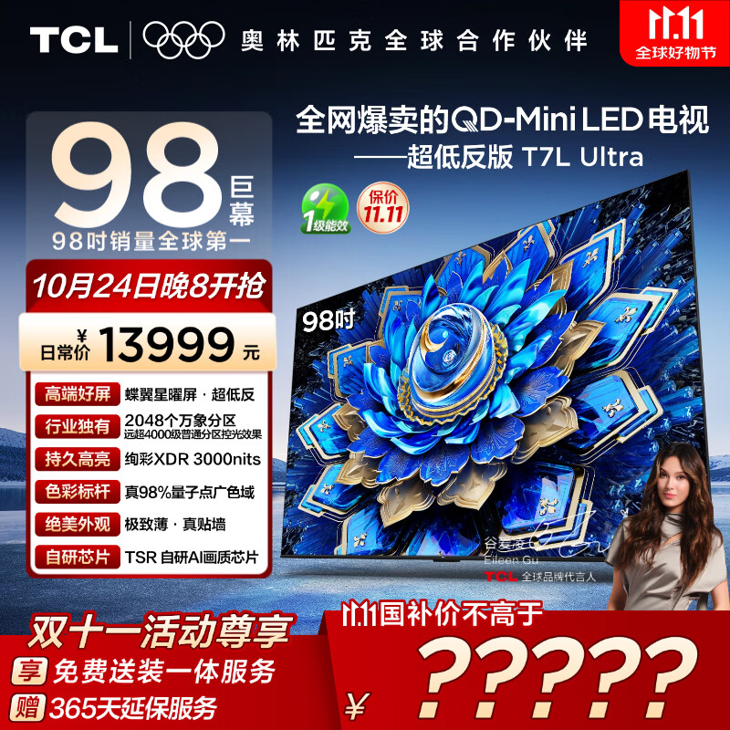 TCL电视 98T7L Ultra 98英寸 QD-Mini LED 蝶翼星曜屏 万象分区 绚彩XDR 98/100英寸电视 国家补贴