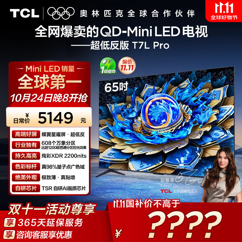 TCL电视 65T7L Pro 65英寸 QD-Mini LED 蝶翼星曜屏 万象分区 绚彩XDR 超薄 国家补贴