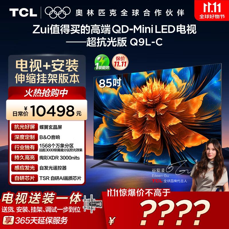 TCL 85Q9L-C 包安装版【伸缩挂架送装一体】85英寸 QD-Mini LED Q9L超级抗光版 国家补贴