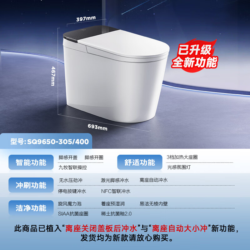 九牧(JOMOO)黑魔方轻智能马桶一体机坐便器全自动冲水一级水效恒温座圈SQ9650 SQ9650 305/300mm (295-390以内选择)
