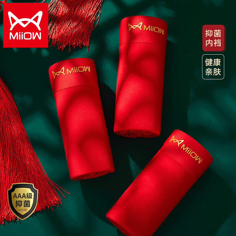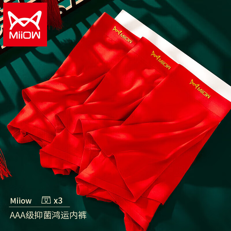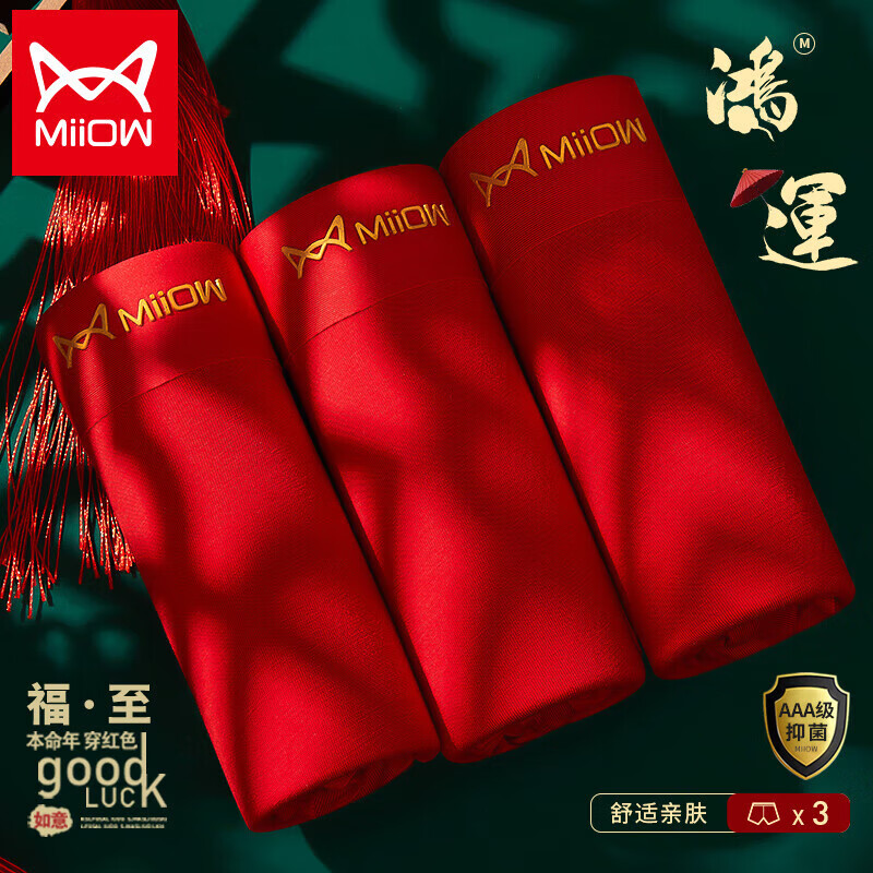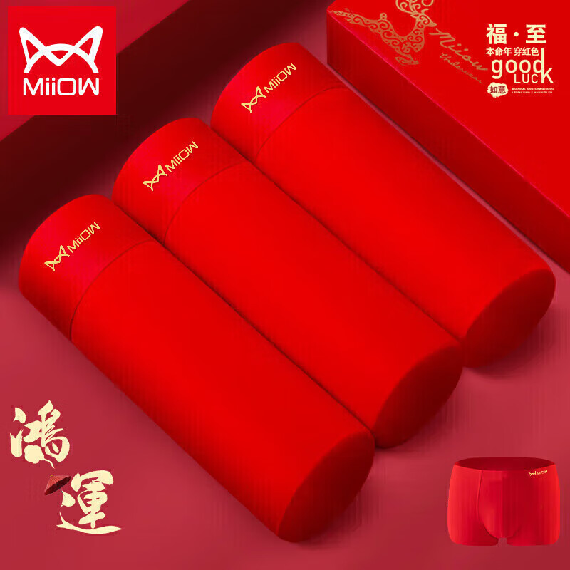 猫人大红内裤男士平角鸿运本命年结婚四角短裤头轻奢3条礼盒装4XL