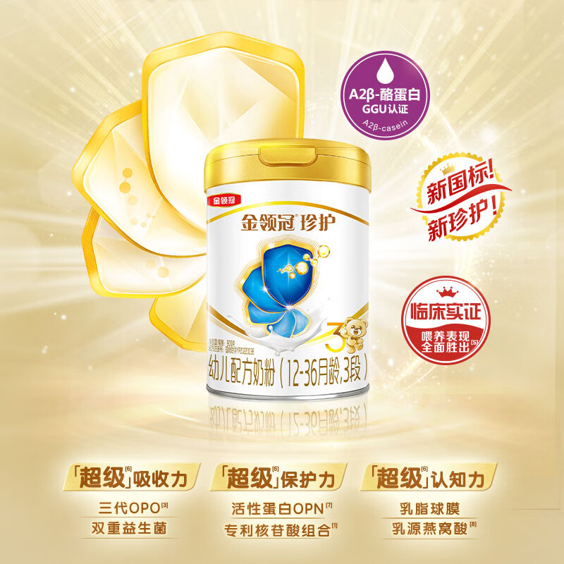 伊利金领冠珍护【三代OPO好吸收】幼儿A2β-酪蛋白奶粉3段(1-3岁)900g